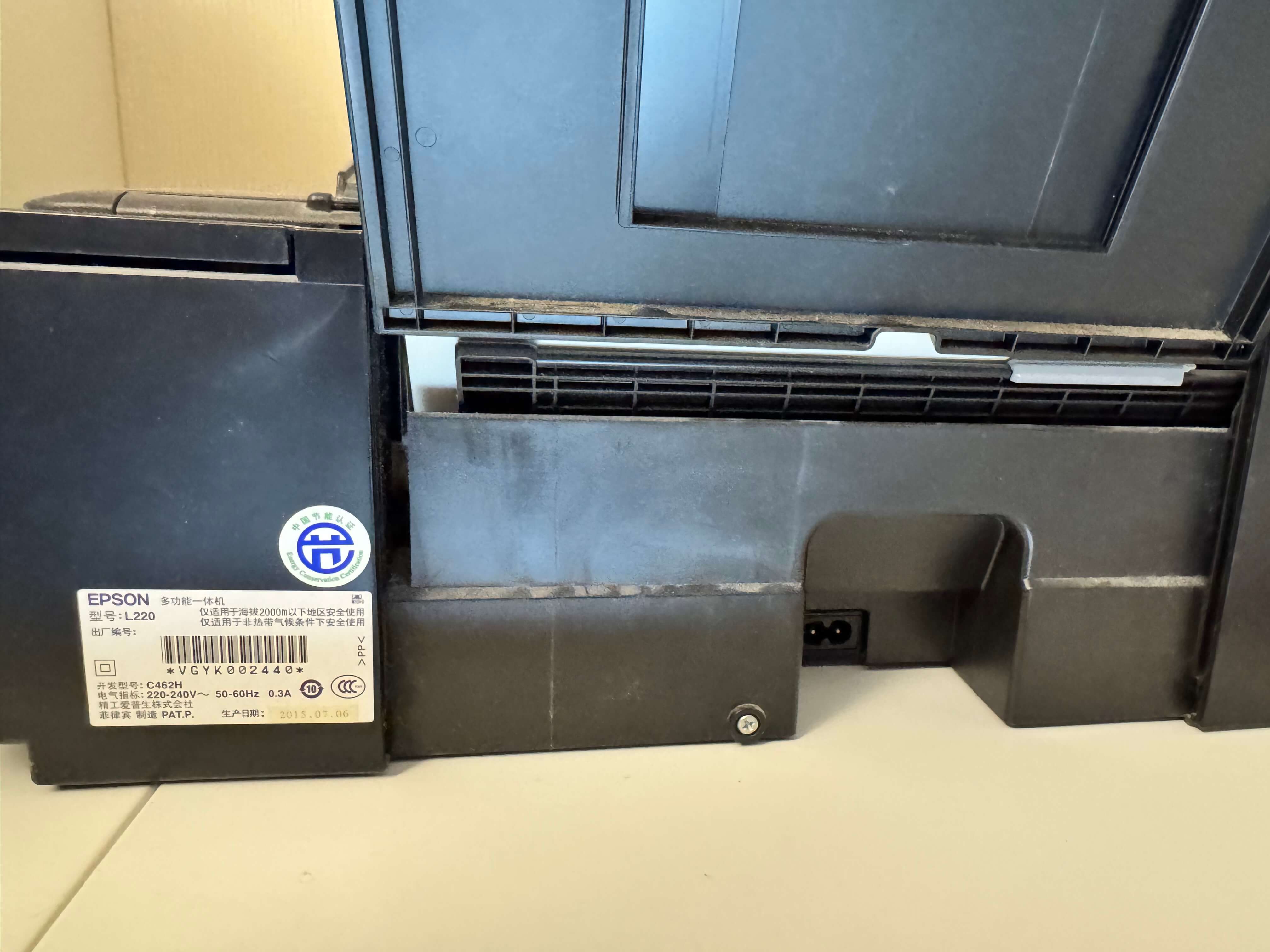找到 EPSON L220 背后的一颗螺丝,拧下来,然后把打印机立起来: