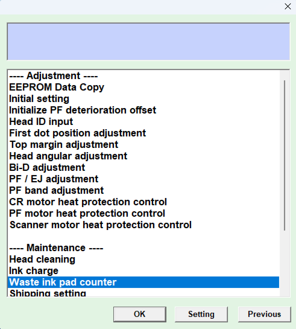 进入后会看到一个列表,在 Maintenance 里找到 Waste ink pad counter: